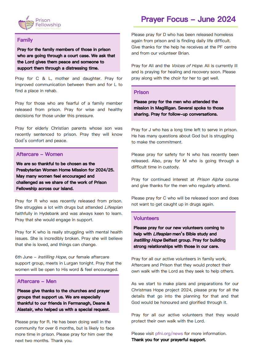 A Christian ministry responding to the spiritual, emotional, social and physical needs of prisoners, released prisoners and their families.